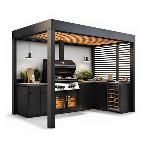 The Evergreen Modular Outdoor Island is a streamlined, contemporary outdoor kitchen designed for compact spaces. Featuring matte green cabinetry with stainless steel trim, a four-burner grill, integrated sink, and expansive counter space, this modular unit focuses on efficient layout and understated style擁deal for patios and terraces where a clean, modern look is desired.